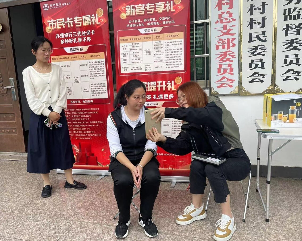 村委工作人员通过微信群、邻里互通等方式告知村民绍兴银行上门换卡服务。活动现场,热闹非凡,支行工作人员分工合作,现场收集市民卡资料,为村民讲解第三代市民卡使用常识,解答村民疑惑,并积极宣传防范网络诈骗及养老诈骗等反诈知识。