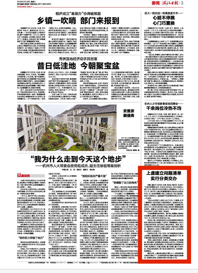 浙江在线绍兴频道2月13日讯(浙江在线记者 朱银燕 通讯员 金爱丽)今日浙江日报第三版刊发报道《上虞建立问题清单 实行分类交办》,全文如下:
