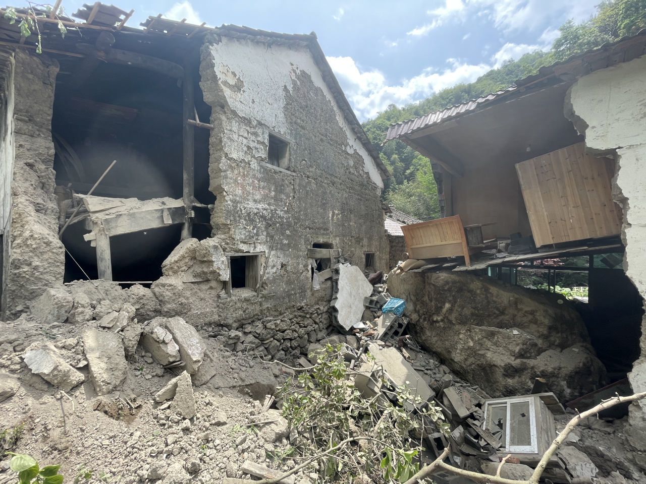 其中,小将镇新欣村马力坑自然村山体斜坡上的孤石失稳发生崩落,由半山腰滚落至坡脚汪海娟等6户屋后,造成多间房屋被崩塌滚石砸毁。出现灾情后,浙江有色地勘集团有限公司地质环境事业部技术人员第一时间赶赴现场,溯源摸排地质灾害及隐患情况,迅速划定危险警戒区域,并协助管理部门紧急撤离区内人员,同时为后续处置方案提出专业意见。