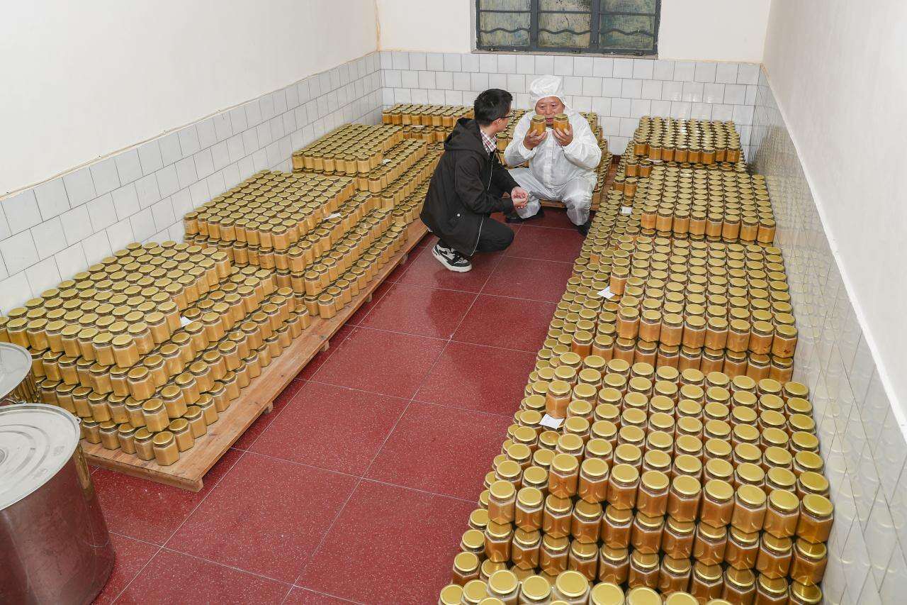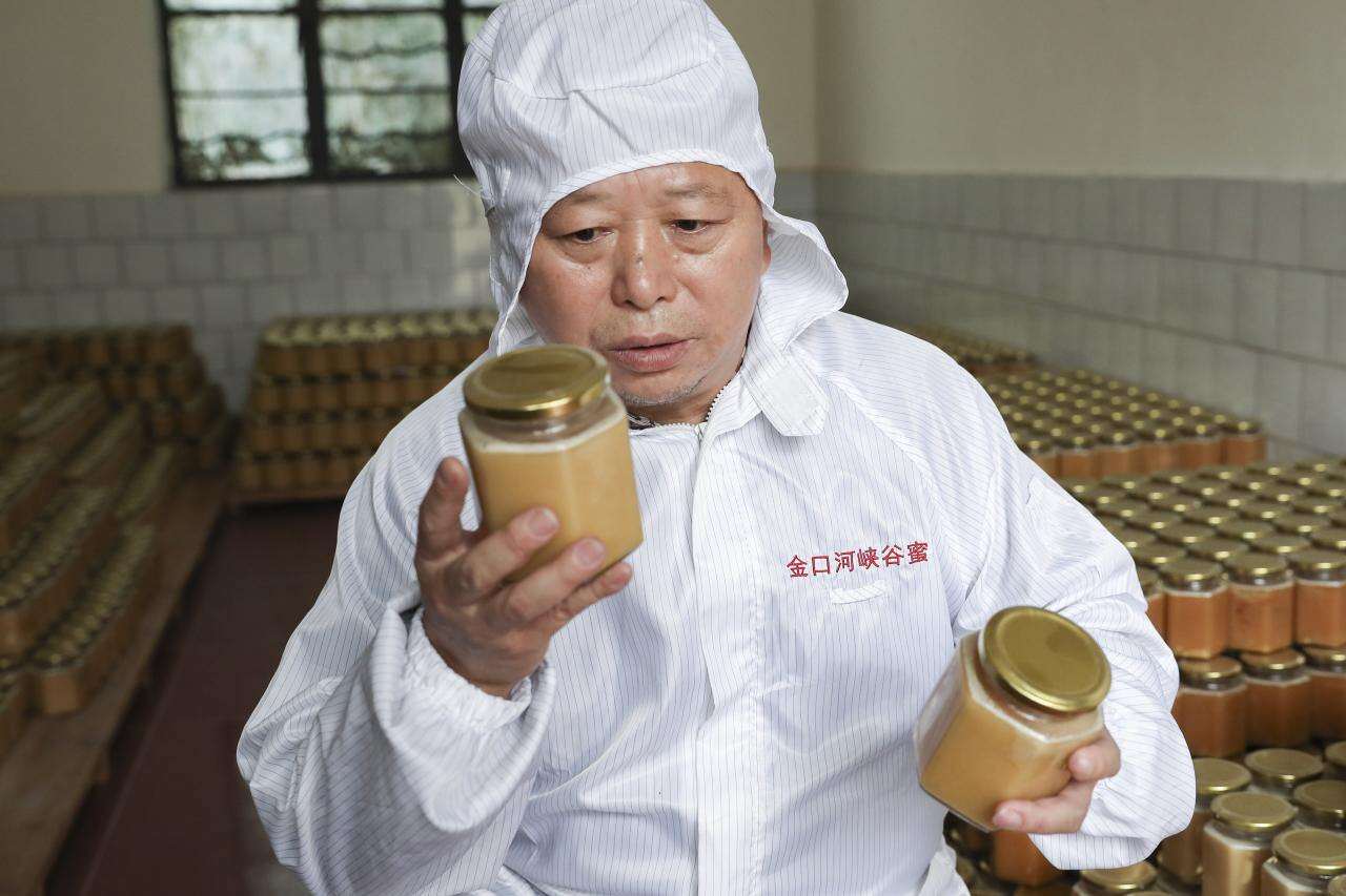 蜜源农业服务中心负责人刘崇贵正在检查蜂蜜