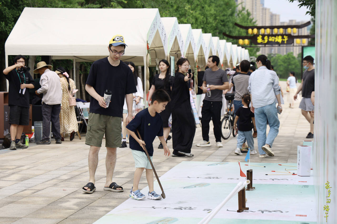 在五甲渡城市公园至漫游娥江码头的2公里江岸线上,射五毒、捶丸、蹴鞠等传统游戏区人头攒动。72岁的市民王大爷带着5岁孙子玩转蹴鞠后感慨:“这些老底子游戏,现在年轻人也爱玩!”非遗手作区同样火爆,竹编龙舟、孝女曹娥剪纸等体验项目深受游客欢迎。