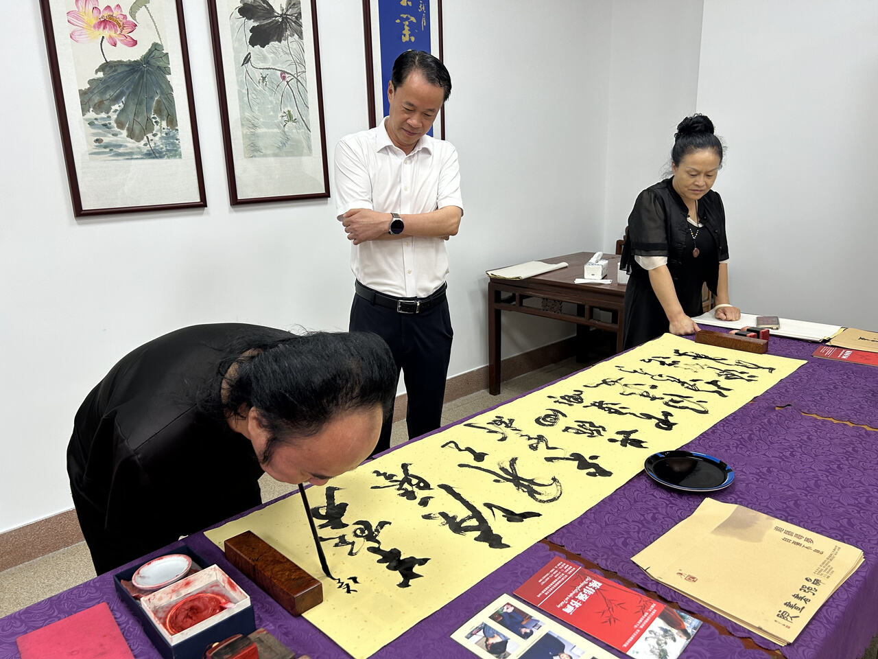 据悉,本次展览以“弘扬抗战精神、歌颂伟大祖国”为主题,展出了涵盖书法、山水、花鸟等多种题材的数十幅书画作品。这些作品未来将作为长期陈列,持续向公众开放。“书画是我与夫人共同的挚爱,也正是对艺术的共同追求与理想,让我们走到了一起。”陈伟强在展览现场深情地说道。值得一提的是,不少展出作品由夫妇二人联袂创作,一笔一墨间,既体现了“书画同源”的传统理念,也展现了二人心有灵犀、默契相融的艺术境界。