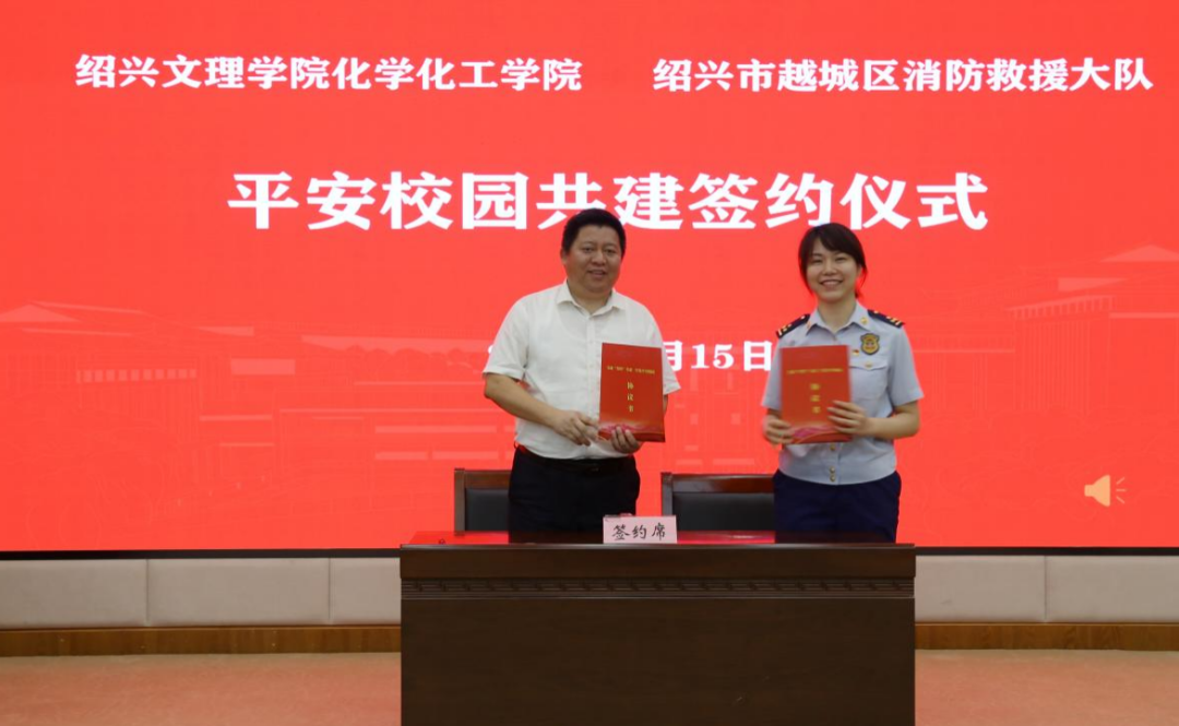 为深入推进党史学习教育,充分发挥消防和地方高校各自优势,更好地推动和维护地方经济社会发展,6月15日下午,绍兴文理学院化学化工学院与越城消防举行“党建契约共建,共筑平安校园”共建协议签约仪式。