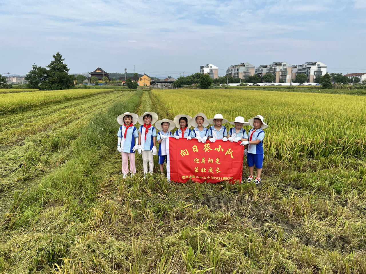 “锄禾日当午,汗滴禾下土,谁知盘中餐,粒粒皆辛苦。”每年7月上旬至8月下旬,是传统农业抢收早稻、抢播晚稻的“双抢”时间。7月17日上午8点,位于绍兴市柯桥区黄贤村的稻田里热浪滚滚,来自塔山中心小学一(2)班向日葵小队的同学们正热火朝天地投入“双抢”劳动中。