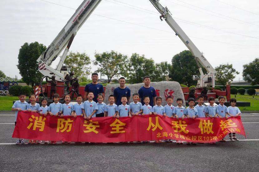 同学们都知道火警电话是“119”,可在生活中却没有使用过这个号码,接通电话后要跟接线员说些什么?哪些是必须要说的关键信息?又有哪些自救的办法?10月3日上午,北海小学梅山校区一(3)班小队朵朵浪花小队带着这些疑问实地参观了绍兴市越城区袍江新区消防救援大队。