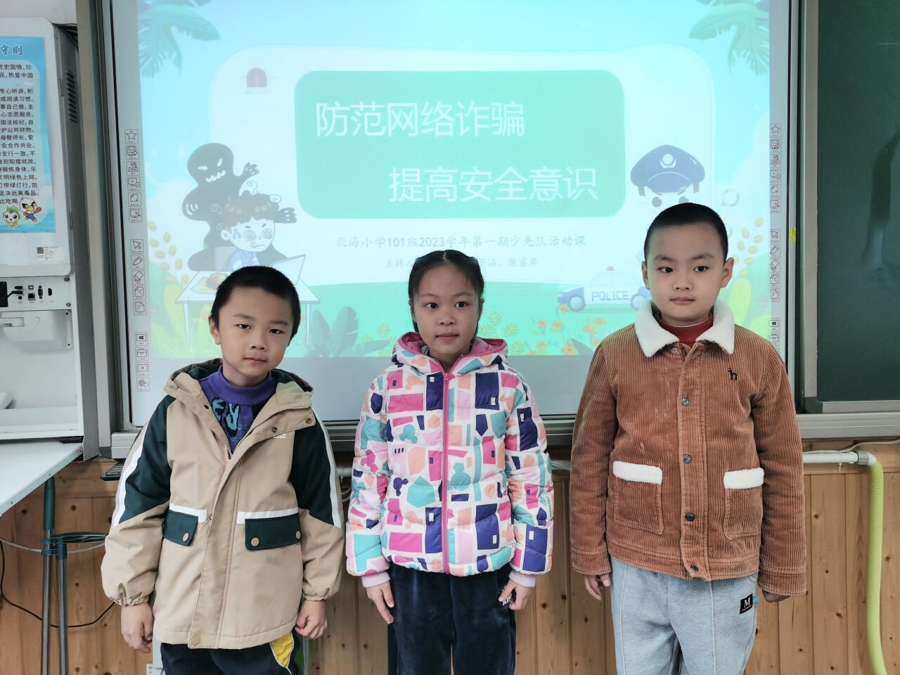 网络已经成为大家日常生活中不可分割的一部分,然而当下,各种网络诈骗事件也是层出不穷、防不胜防。为提高同学们的防诈骗意识,加强校园安全教育,11月15日,绍兴市北海小学胜利校区101班开展了一场“防范网络诈骗、提高安全意识”为主题的少先队活动。