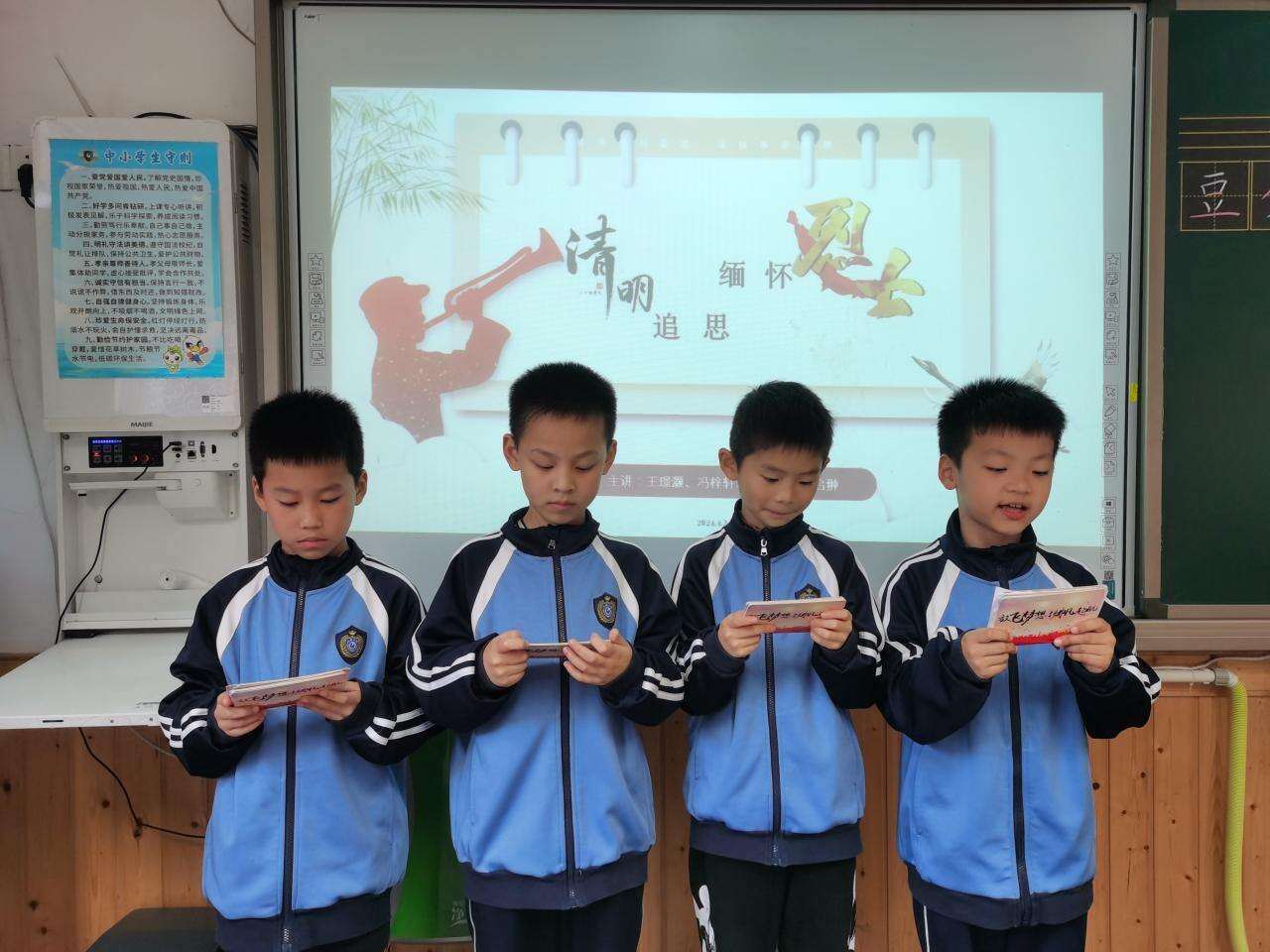 为弘扬中国传统文化,引导学生慎终思远、缅怀先烈,增进爱国、爱社会主义情感,充分营造文明和谐的校园环境,近日,绍兴市北海小学胜利校区101班开展了以“清明追思 缅怀先烈”的主题班队活动。 活动中,四位主持人分别从清明节的由来、清明诗歌朗诵、英雄人物事迹讲述等方面开展活动,不仅让同学们感受传统文化的魅力,更是启迪学生心灵,追思先辈,激发他们强烈的爱国热情。 通过“清明追思 缅怀先烈”主题教育,让学生缅怀先烈、悼念革命烈士的高贵品质,继承先烈遗志,珍惜当下,刻苦学习,树立从小为中华民族宏大复兴而不懈奋斗的高尚抱负。