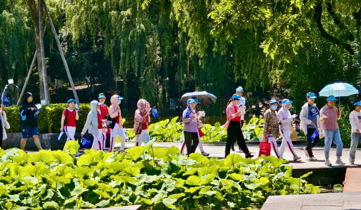 健步走路线沿着名人广场的荷叶池,沿途的风景美不胜收,池水波光粼粼,荷叶微风拂面,仿佛都在为这群热爱生活的人们加油鼓劲。一路上,大家步伐矫健,意气风发。路线上精心设置了三个寓教于乐的禁毒知识互动点:识毒明害站,居民们手持禁毒知识卡牌,在聆听后踊跃参与辨识挑战;标语拼智慧,参与者需化身“禁毒宣传员”,动手动脑将散落的字块重新拼接成完整有力的禁毒宣言;英雄砺心志,居民们在此驻足凝望,阅读那些为守护万家灯火而负重前行甚至献出生命的英雄故事,在静默中铭记奉献,汲取前行的力量。