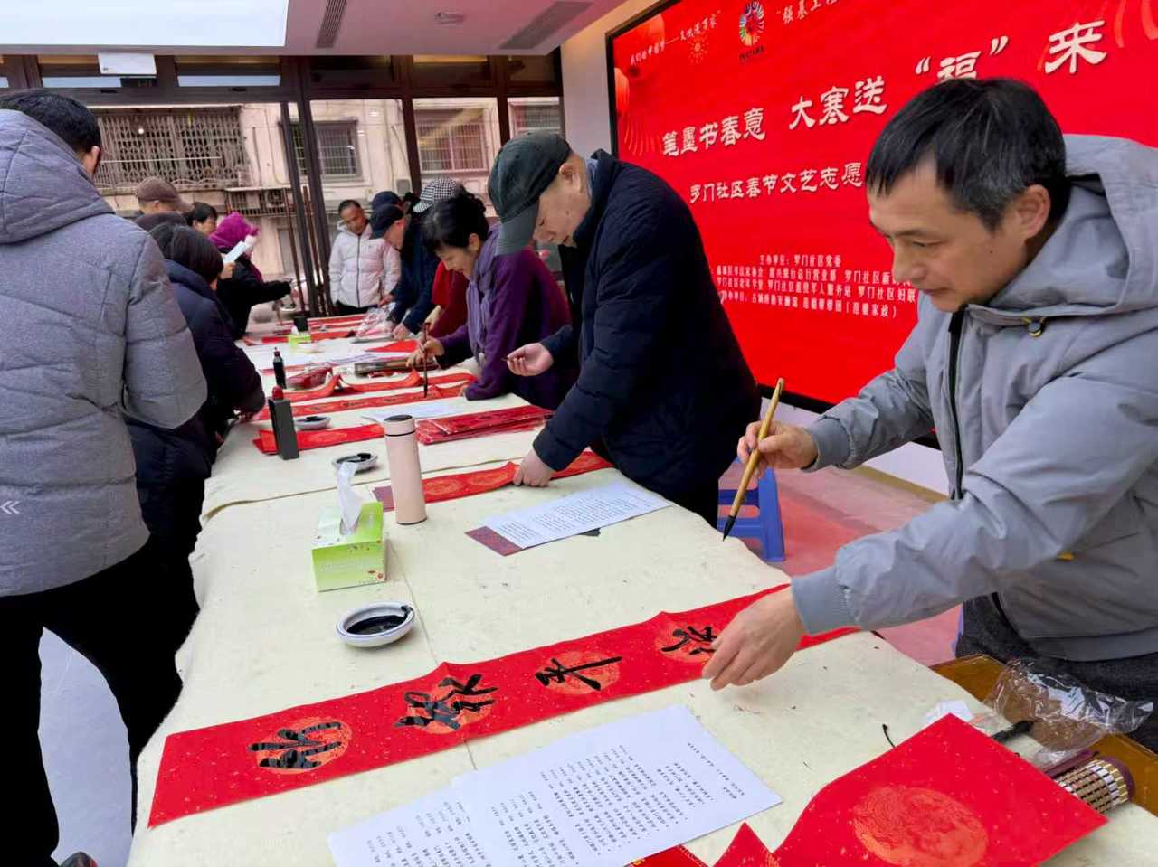 1月20日大寒时节,绍兴古城瑞雪纷飞,越城区塔山街道罗门社区新邻里中心内暖意融融,“笔墨书春意 大寒送‘福’来”主题活动在这里温情开展。