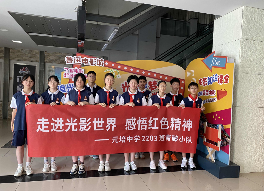 近日,市元培中学初二(3)班青藤小队来到了鲁迅电影城,开展“观红影、悟初心”红色主题研学活动。