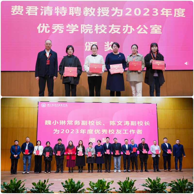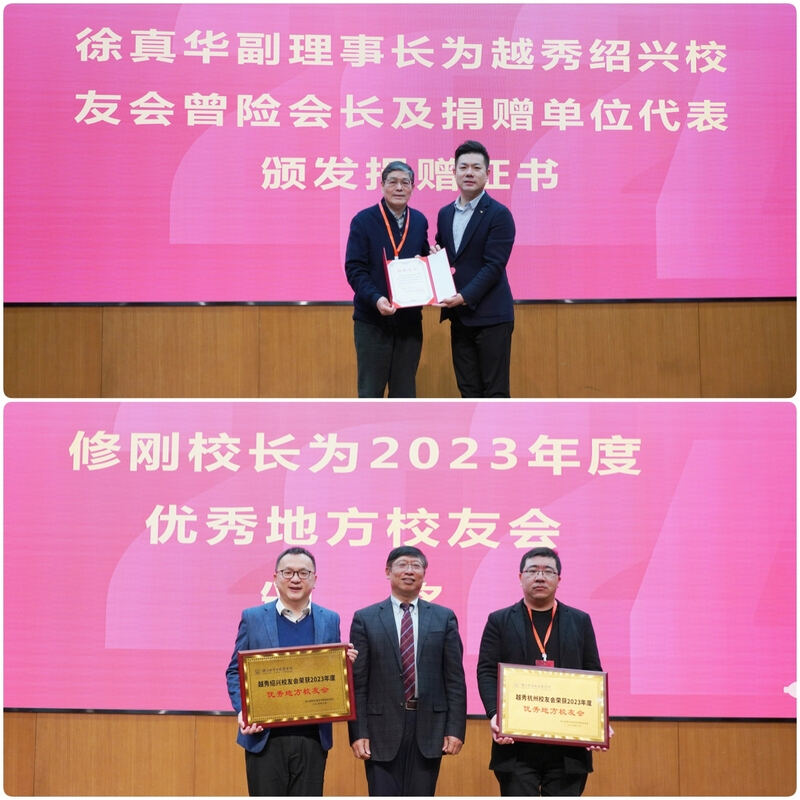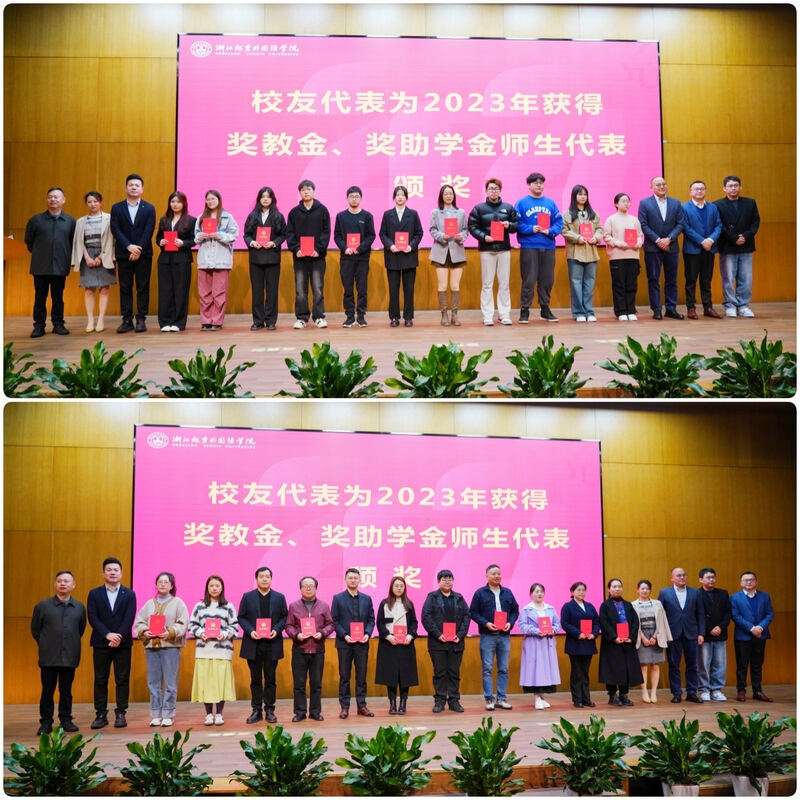 会上,浙江越秀外国语学院副理事长徐真华为捐赠校友代表新西兰利杰国际集团董事长曾险和两家企业代表颁发捐赠证书,感谢他们对学校事业的鼎力支持。修刚校长、费君清特聘教授、魏小琳常务副校长、陈文涛副校长分别为优秀地方校友会、优秀学院校友办公室和学校优秀校友工作者颁发了荣誉证书,以表彰他们在校友会工作中的突出贡献。此外,校友代表章小军、曾险、应华亮、冯迪洋、朱重阳、江建琴为学校2023年获得奖教金、奖助学金的师生代表颁奖,激励广大师生接续奋进,为学校高质量发展贡献智慧和力量。