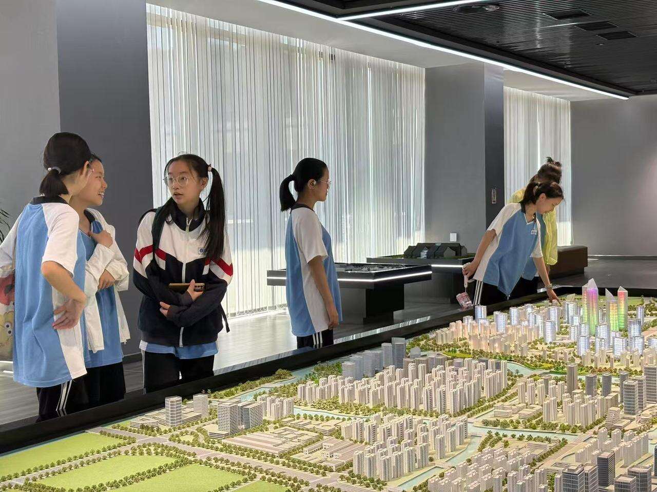 在“城市规划”展区,巨大的沙盘模型让同学们眼前一亮:古城保护区内,鲁迅故里、沈园等历史建筑原貌留存;新城片区,高楼林立的科创园区与四通八达的轨道交通勾勒出未来图景。“大家快看,我找到我们建功中学了!”一位同学指着沙盘兴奋地说。
