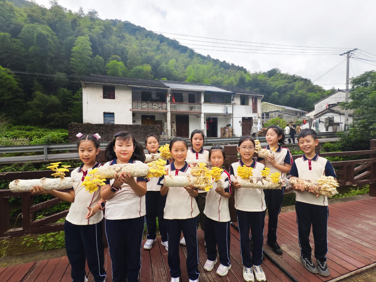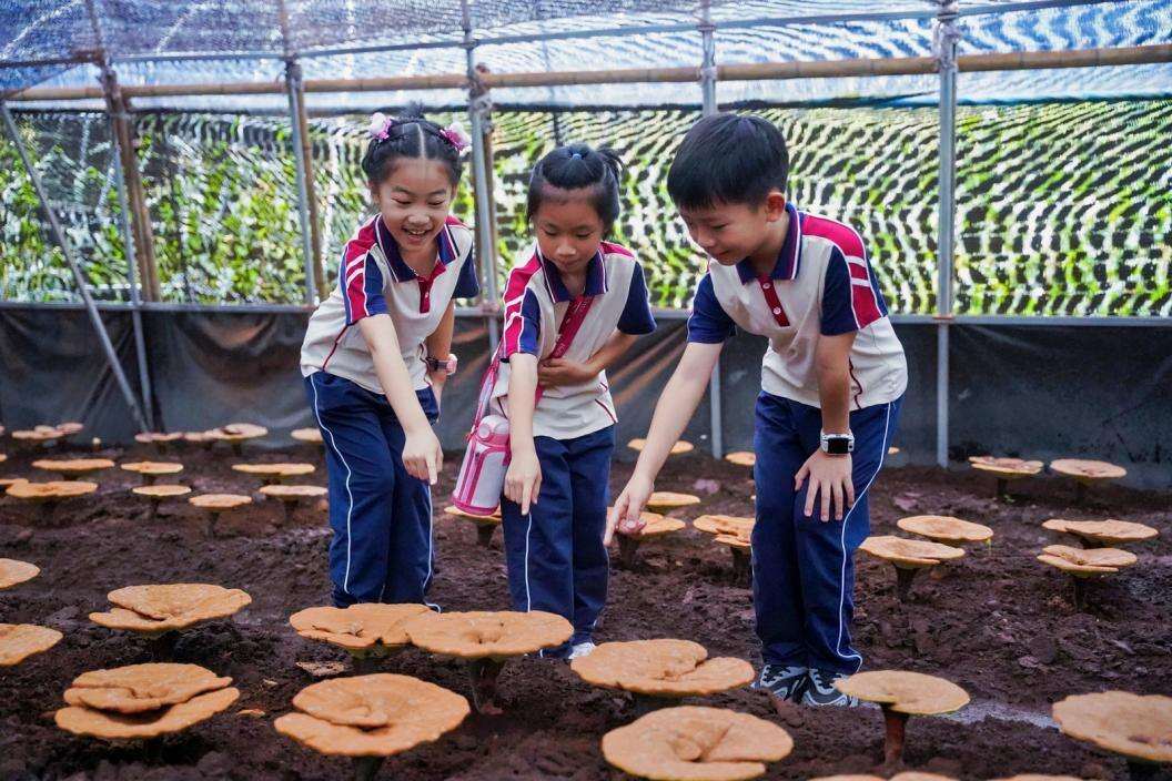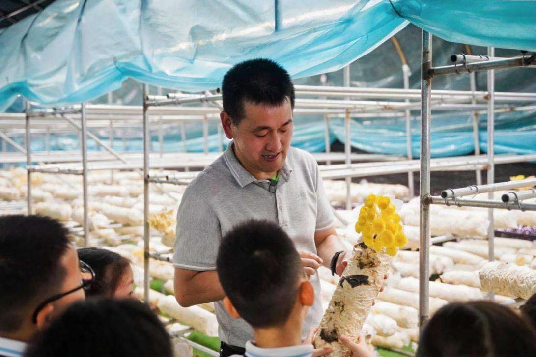 在“柯桥区金牌书记”任利成的指导下,孩子们化身“自然侦探”,深入千余平方米的现代化菌菇基地。从灵芝棚的“黑精灵”到粉菇棚的“粉红仙子”,任伯伯用拟人化语言揭秘菌菇生长奥秘:“蘑菇宝宝住在哪里?”“它们的‘小伞’如何撑开?”通过触摸菌丝、观察喷淋系统、聆听气候调控知识,孩子们直观理解了环境与生命的依存关系,更惊叹于现代农技对乡村产业的赋能作用。