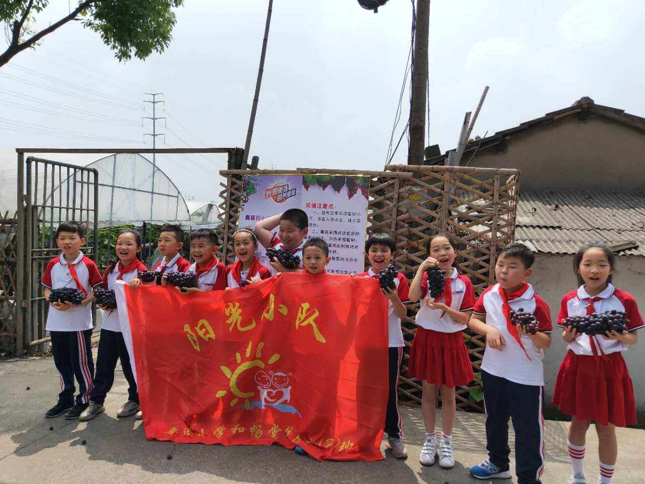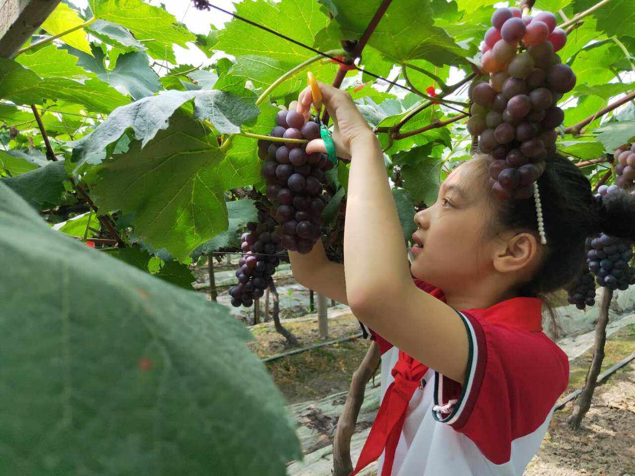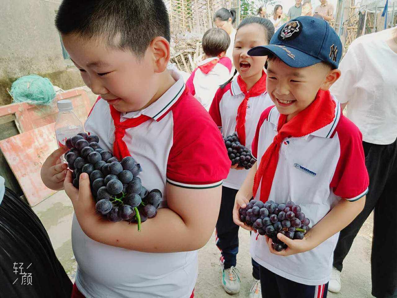 6月23日下午,阳光普照,鲁迅小学和畅堂校区二(3)班的同学们来到马山镇尚巷村的小师爷果园采摘葡萄。一到葡萄园,只见连片的白色大棚,大棚里面站立着许许多多的葡萄架,葡萄架上挂着一串串紫色葡萄,好像一颗颗紫色的玛瑙,又像是一个个紫色的小精灵,好像在招呼着同学们的到来。