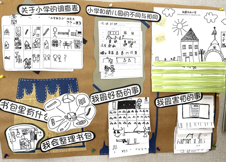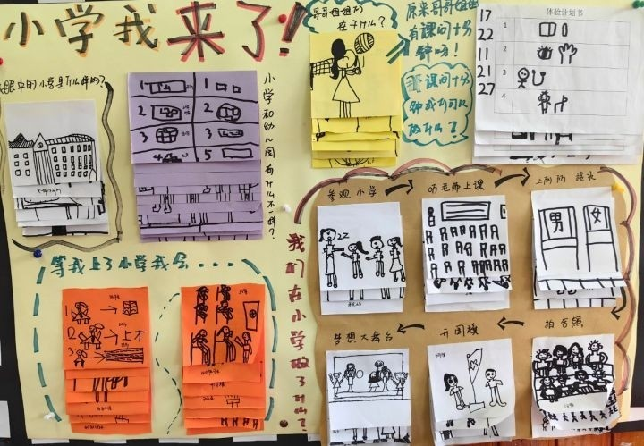 在参观小学前孩子们就利用绘画、调查等表征方式将期盼和疑问进行了记录并绘制成了儿童海报。