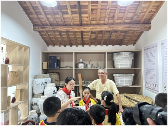 品黄酒之香:以黄酒为“金名片”的南村村全力打造”黄酒源乡家庭手作酿造聚集地”,致力于手工黄酒文化的传承。队员们怀着无比憧憬的心情来到南村黄酒酿造工坊。酿酒师吴师傅兴致勃勃地为队员们一步一步详细讲解如何酿酒,队员们津津有味地聆听、学习、记录。吴师傅的娓娓道来让队员们在作坊里沉浸式体验了酿酒的过程,了解了古法酿酒的八步骤——浸米、蒸饭、落缸、开耙、灌坛、压榨、煎酒、封坛。