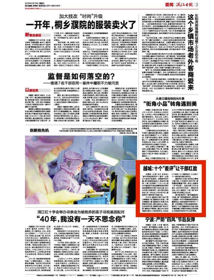 浙江在线绍兴频道2月15日讯(浙江在线记者 阮帅 徐添城)今日浙江日报第三版刊发报道《越城:十个“差评”让干部红脸》,全文如下: