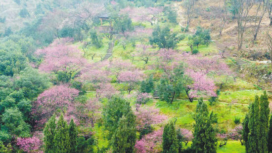 转过几个小山湾,“斯舜梅园”几个大字跃入眼帘。走上石阶相望,各色梅花似霞,点缀在墨绿色的山间,与氤氲的雾气浑然交织,恍如仙境。