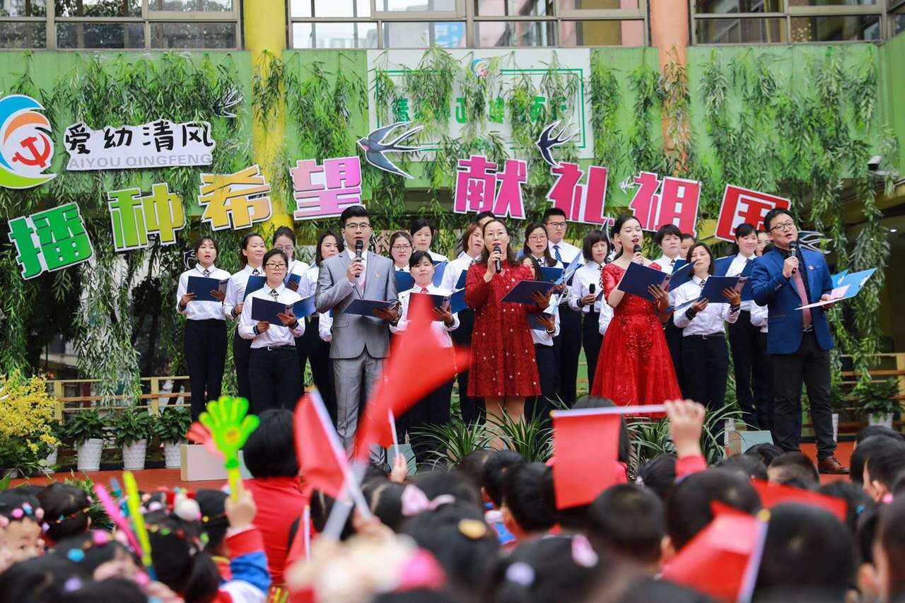 活动在激情彭湃的党员诗朗诵《春天的故事》中拉开序幕,青春洋溢的教师舞蹈《春之韵》、全员参与的“快闪”《我和我的祖国》、情景剧《五娃献礼》等内容丰富、形式多样的节目一一登台展示,博得台下小朋友和家长们的阵阵掌声。
