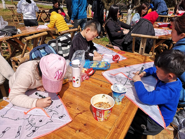下午,孩子们彩绘风筝,一起将亲手绘制的风筝放飞。