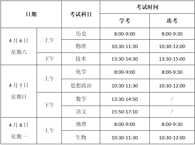 本次学考选考共开考九个科目,历时两天半。除语文、数学仅提供学考试卷外,思想政治、历史、地理、物理、化学、生物和技术各科均提供学考、选考两种试卷。学考时长60分钟(语文、数学各80分钟),选考时长90分钟。具体时间如下: