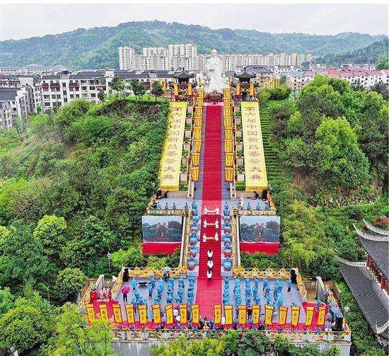 浙江在线绍兴频道4月12日讯(浙江在线记者 孙良 郑培庚 通讯员 小应 )4月11日,2019中国茶叶大会·绍兴茶叶博览会·第十三届新昌大佛龙井茶文化节在新昌中国茶市开幕。开幕式上举行的茶祭大典包括鸣炮、献贡品、敬香、击鼓撞钟、奏乐、献茶敬茶、恭读祭文、献祭舞等传统仪式。古朴肃穆的茶祭大典,充分展示出新昌茶文化的独特魅力,再现了新昌绵延千年的茶祭传统风俗。