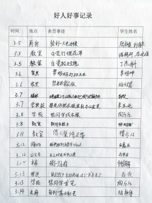 “学生自己做了好事,或者发现了好人好事,都可以记录在上面。”该班班主任李琴说,好人好事簿推出一个多月以来,孩子们都争着要做好事,“以前我曾用做好事发奖券的方式鼓励学生互帮互助,但效果没有现在好。”李老师说,现在学校的走廊、操场、楼梯等地很少见到纸屑等垃圾了,就连老师办公室倒垃圾的活也被孩子们承包了。