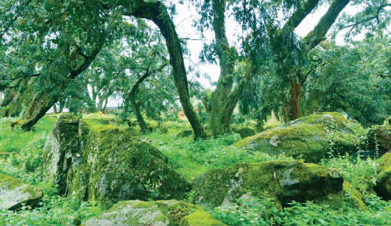 几年前,地质勘查部门来到平均海拔800米、处于会稽山西白山山腰处的山村,发现其山坡沟谷有大面积堆叠的岩块分布,是典型的崩塌堆积地貌,岩块之间错落生长着上千棵古香榧树,形成如水墨画卷般的“巨石榧林”景观,属于环境地质遗迹景观大类中的山体崩塌遗迹景观亚类。