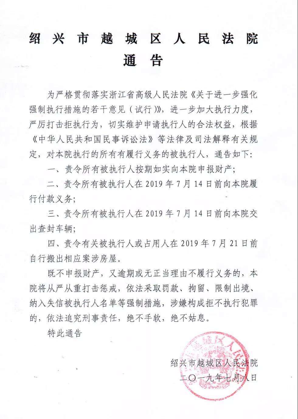 浙江省高级人民法院发布“史上最强强制执行措施”即《关于进一步强化强制执行措施的若干意见(试行)》以来,越城区人民法院不折不扣贯彻执行,执行力度持续加大,部分被执行人感受到压力,主动积极履行了生效法律文书确定的义务。但仍有一部分被执行人没有认清形势,心存侥幸。现越城区人民法院根据执行工作的相关规定,向越城区人民法院执行的所有有履行义务的被执行人,责令按期如实申报财产。对有付款义务的、有交付查封车辆义务的、有腾退义务的三类人员,发出执行通告,责令在越城区人民法院限定期限内履行义务。上述公告在绍兴日报、绍兴晚报、越城区人民法院官网以及各大媒体上全面公开发布。如果被执行人仍拒不履行的,越城区人民法院将从重从严打击,绝不姑息手软。
