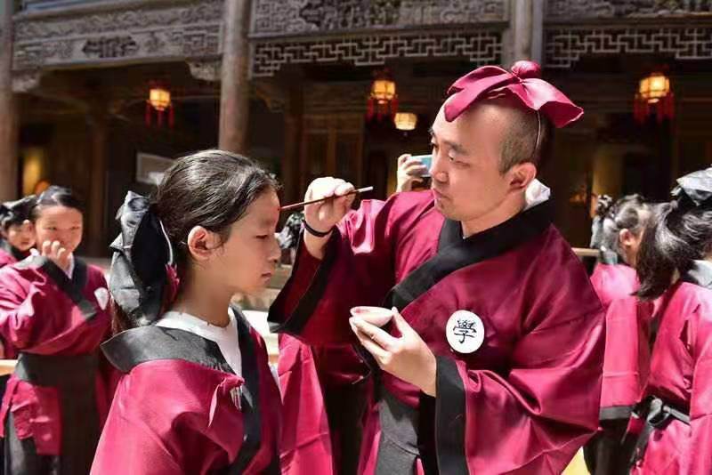 近日,一群身着汉服的孩子来到东方山水二期感受独具特色的国学体验,他们学习传统的揖拜之礼,和“老先生”一起向孔老夫子作揖敬拜。在昔时明朝太子学习过的“龙川书院”,感悟历史的兴衰。做折扇,刻印章,孩子们在老师的指导下,学习和传承传统的书法和印刻技艺,亲手制作出属于自己的“国学礼物”。这是绍兴市“红领巾动感假日”暑期公益夏令营的第七站——东方山水国学体验营。