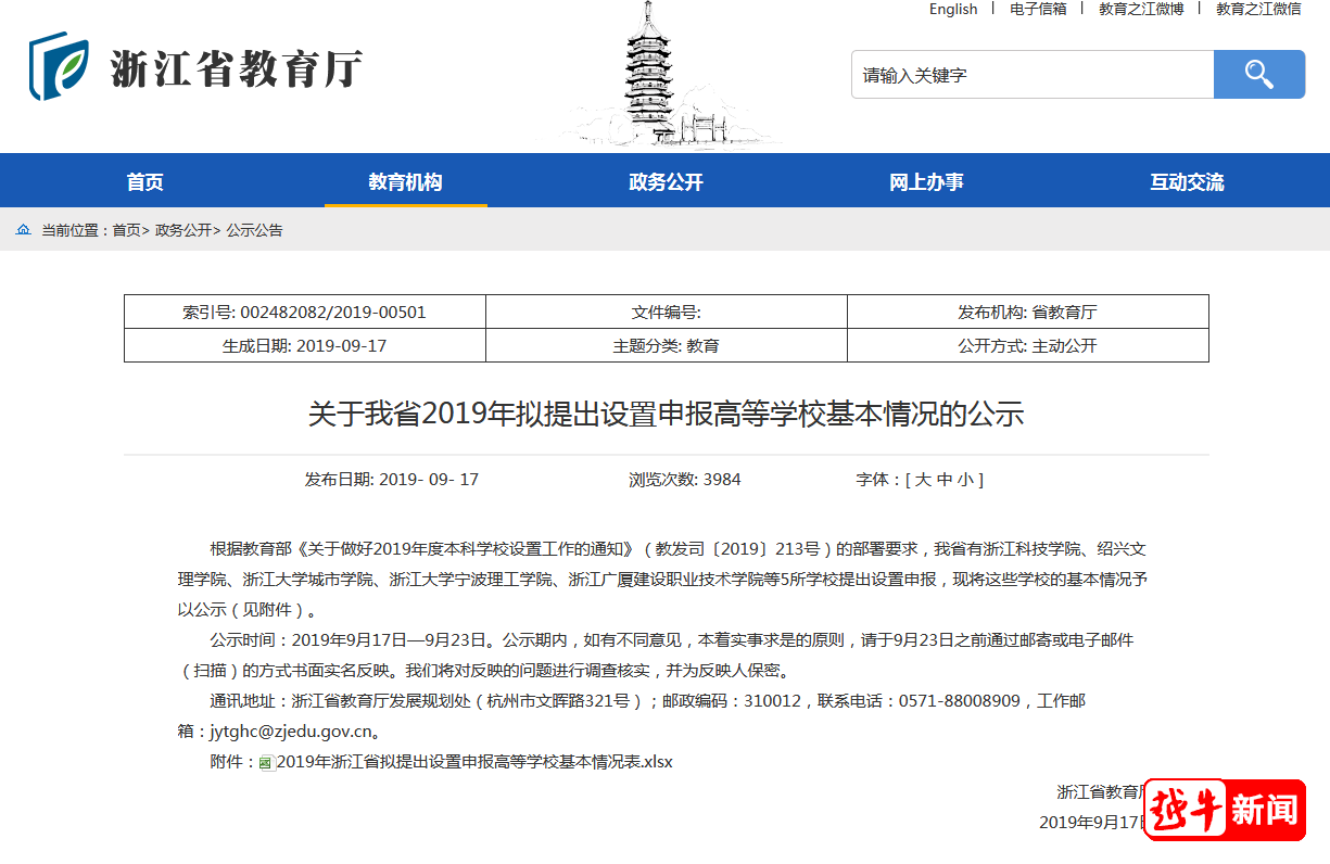 9月17日,浙江省教育厅官网发布了《关于我省2019年拟提出设置申报高等学校基本情况的公示》。记者看到,在更名大学申报表中有浙江科技学院、绍兴文理学院等高校,在独立学院转设、本科层次职业教育试点表中有浙江大学城市学院、浙江大学宁波理工学院、浙江广厦建设职业技术学院等高校。