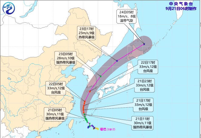 “塔巴”预计将以每小时20公里左右的速度向北偏西方向移动,21日凌晨进入东海,之后沿东经125度附近北上,强度逐渐增强,最强可达强热带风暴级或台风级(11~12级,30~35米/秒)。受其外围环流影响,绍兴市从9月20日开始偏北风逐步加强,今天可能出现7~8级阵风,局部8级以上,局部大到暴雨。