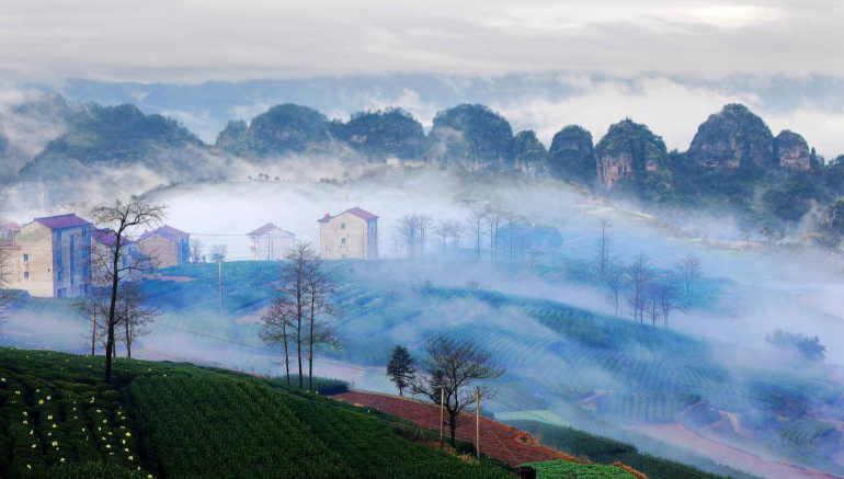 下岩贝村位于新昌县东茗乡,村庄风光秀丽,茶园青翠,多有云雾缭绕,可俯瞰韩妃江Ω大拐弯,纵览十九峰,是“百里丹霞观光道”的重要节点。环抱碧绿成行的生态茶园,微风摇曳的竹园松林,白云深处的茶香人家,是理想的自驾露营观景、摄影写生基地。