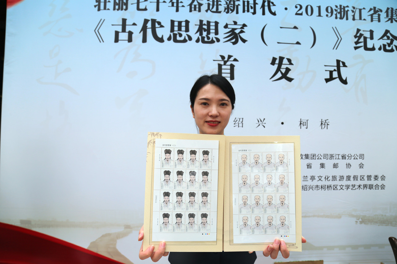 10月7日上午,《古代思想家(二)》纪念邮票首发式暨壮丽七十年·奋进新时代2019浙江省集邮展览在柯桥区美术馆举行,众多集邮爱好者和市民纷纷前来购票和观展。