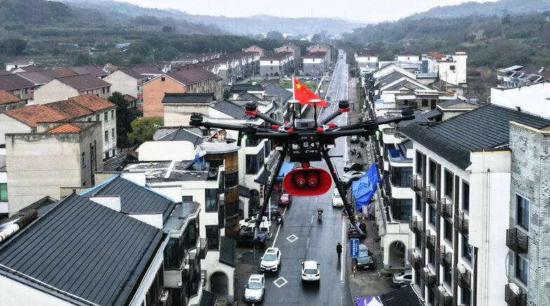 在剡湖街道禹溪村口,记者看到,随着螺旋桨发出的“嗡嗡”声,一架无人机腾空而起,巡特警大队民警正利用无人机搭载喇叭的方式,通过无线对讲机传递语音,向各行政村居民和密集处人群宣传新型冠状病毒感染的肺炎疫情防护知识。