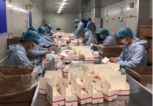 “振德医疗”是全国第二大口罩生产企业,目前10多条生产线已实现全自动。在包装车间,数好30个口罩,叠好后装进盒子里,50盒口罩装成一箱……现场,志愿者们分工明确、有条不紊。
