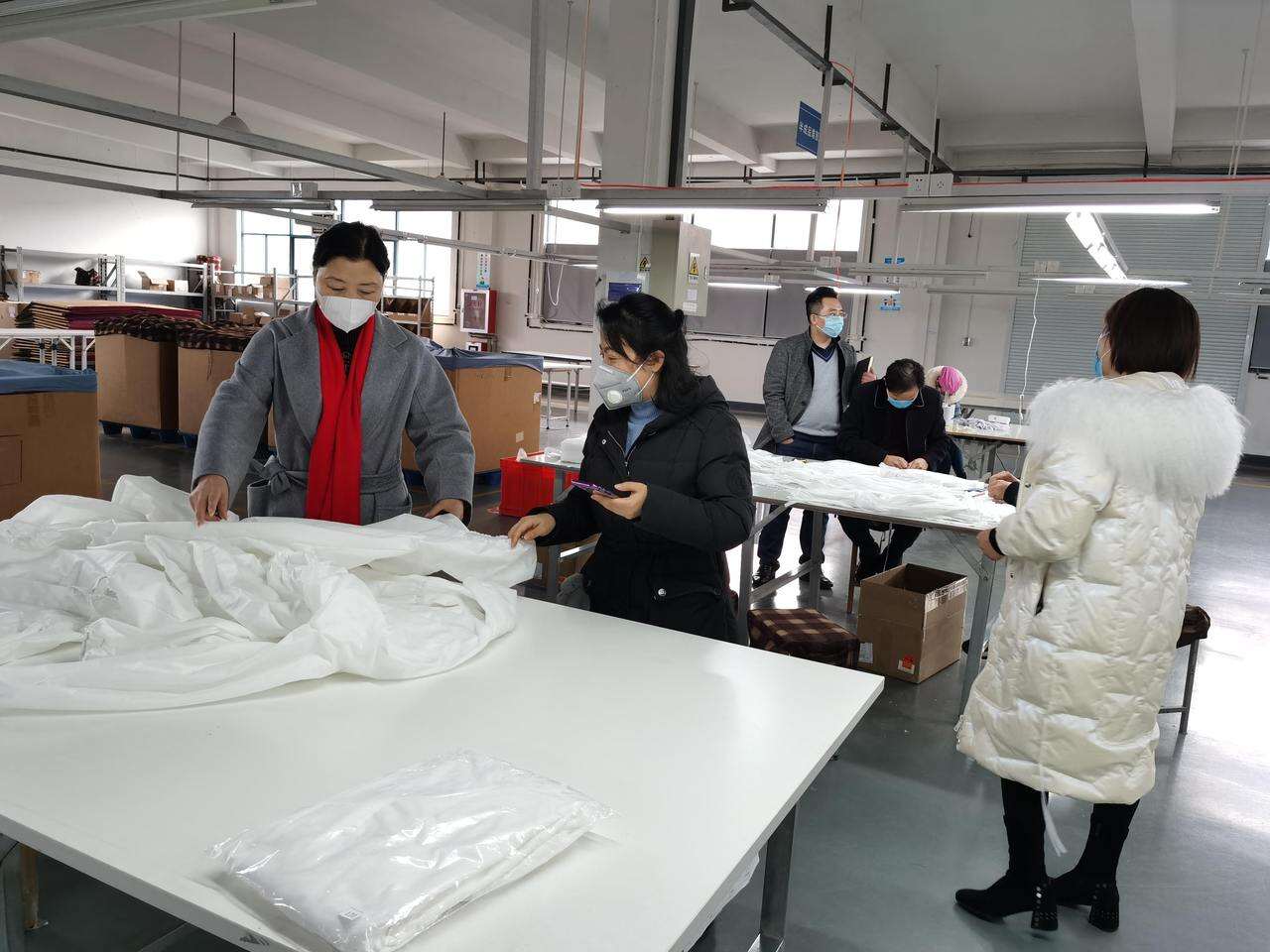 没有工人,徐爱华就和公司高管给老员工一个个打电话,很快从当地招募了20多名熟练工。技术部负责人王晓英第一时间赶到了厂里。“董事长的决定让我们都很感动,我们也想出自己的一点力。我初七去其他工厂学习,当晚回来彻夜打样,第二天就把隔离衣的样品赶出来。”王晓英说。