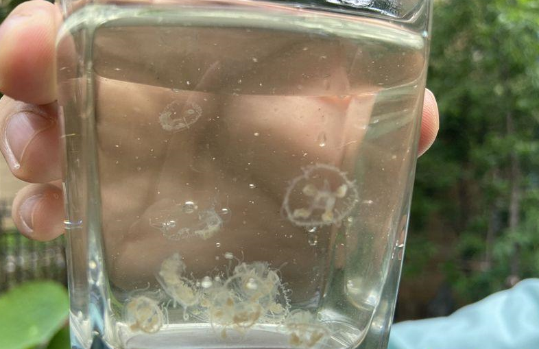 在吴先生家的院子里,有一处约5平方米的小水池,池塘水质清澈,中间放着一块大石头,周边种着一些绿植。透着阳光,六七条观赏型的锦鲤在水池里畅快地游来游去。“你看,除了鱼,里面还有另一种生物。”记者在吴先生的指引下,俯下身定睛看着鱼池的水面,只见数只几近透明的生物抽动着伞状的“小身躯”漂移着。