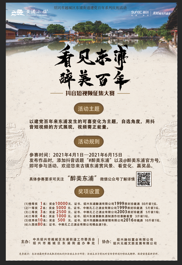 据悉,此次大赛征集时间为4月1日0时—6月15日24时,为期2个多月。参赛者拍摄作品后,添加抖音话题“醉美东浦”,并@醉美东浦 官方账号即可参赛。大赛设置特等奖一名、一等奖2名、三等奖4名、优秀奖10名及入围奖80名,奖品丰厚。其中,特等奖将获得奖金10000元,颁发获奖证书,并赠送东浦20年珍藏陈酿50斤装1坛。