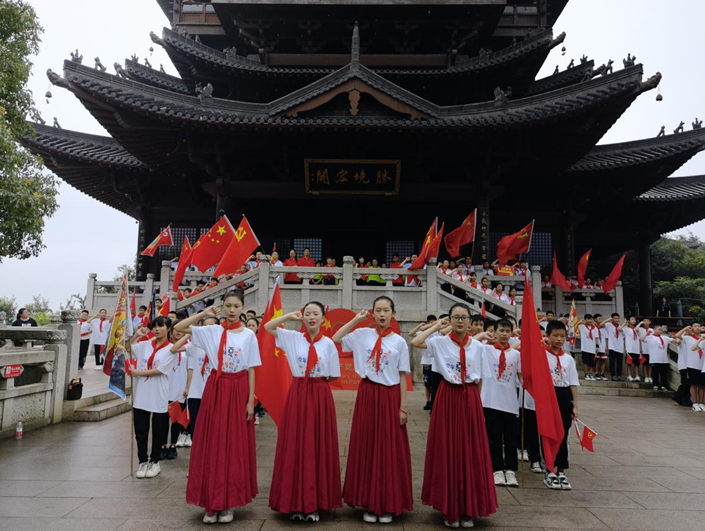 终于登顶“望宸阁”,在青山绿水的环绕下,望宸阁显得格外肃然耸立,此时此刻的每一位老师、家长志愿者和明德少年们满怀豪情,热血沸腾,感慨万千,全体少年队员重温入队誓词。明德师生以天地为舞台,以青山为背景,以回声为音响,百人齐朗诵,声振林越;百人共歌咏,情满半山。