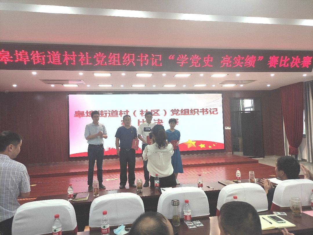 皋埠街道村社党组织书记决赛阶段的评委,由领导评为打分和群众投票打分组成,经过激烈的比拼,最终坝头山村、胜利村两位书记荣获一等奖;牌口村、银桥社区、东龙山村三位书记荣获二等奖;腰鼓山村、银春社区、樊江村、坝内村四位书记荣获三等奖。