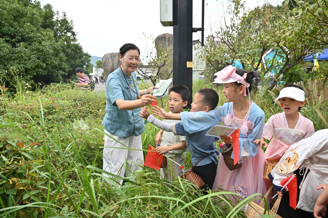 张珍珠出生于中医世家,是上虞老字号“百忍堂”张氏针灸第三代传承人。活动开始,张珍珠拿出三张照片,每张照片都是一味中药。她出示照片,告诉小朋友中药的名称及他们的用途,第一味中药是鸭跖草,第二味中药是葎草,第三味中药是荩草,它们的功效都很厉害,都具有清热解毒良效。她希望小朋友们上山的时候,能用自己善于发现的眼睛采齐这三味中药,这个就是今天研学的第一个任务。