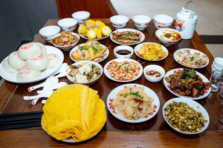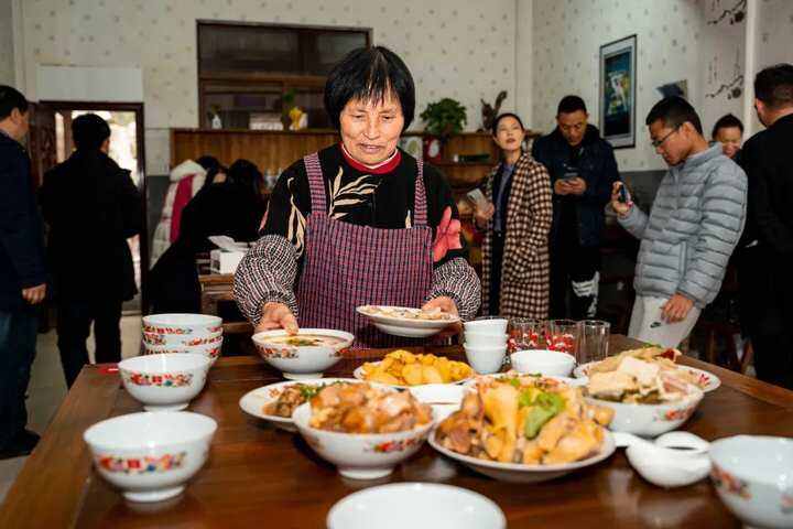 在外婆宴品鉴环节,复古的八仙桌、充满喜庆的餐具、极具外婆坑村风情与儿时记忆的美食被端上桌,菜品香气扑鼻、味道鲜美,充分体现了外婆坑自然、淳朴的特色。