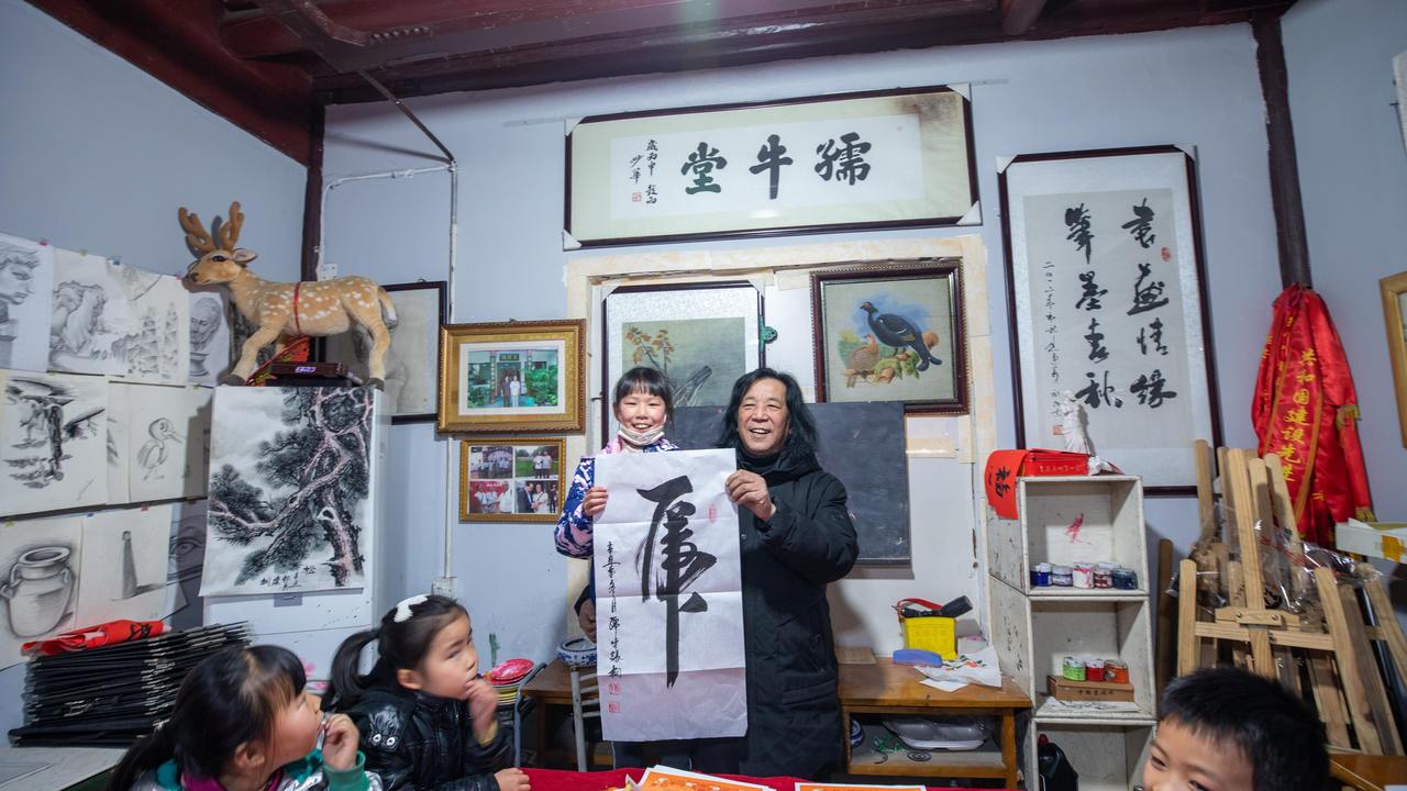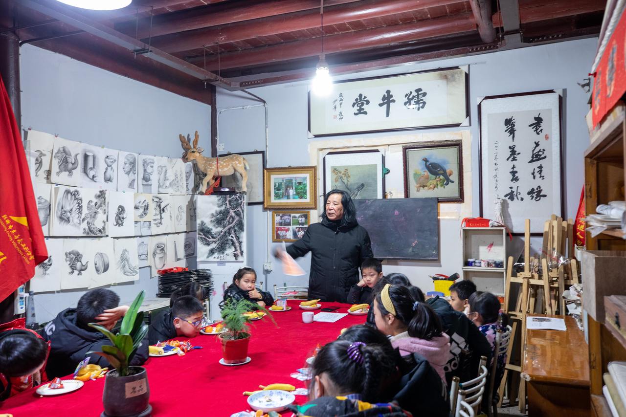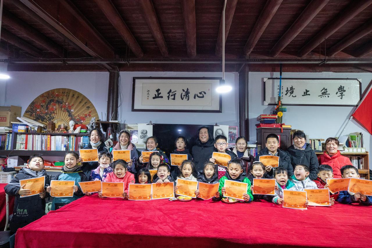 1月27日,一年一度的书画班结业仪式在绍兴儒牛堂书画院举行,儒牛堂书画院院长张桐就是一群孩子们口中的张爷爷,他说他的学生沈依楠小朋友在学校书法比赛中获了一等奖,内心甚是欣慰,今天把小朋友组织在一起就是想好好奖励奖励他们。