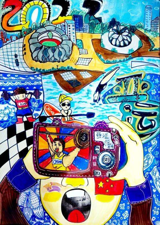 图为中国轻纺城小学二(18)班苏莫小朋友手绘《科技筑梦,喜迎亚运》