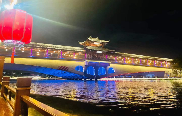 随着游船慢慢往前开,河两岸的景物映入眼帘,渐渐暗下去的城市,缓缓亮起来的夜景。同学们也在移步换景中打开了关于这座城市的记忆。绍兴环城河上有大大小小的桥31座,船行中,一座座桥在月色和灯光的照映下,恬静自然的横卧在环城河上。尤其是风则江廊桥,它是环城河上最美的一座古典风格的桥梁,桥身横跨风则江最宽处,夜色中的它多了几分神秘之感,桥上步云、揽月、淳风、正则,四个桥亭两两相对守望,灯光将它的倩影勾勒在河面上,水桥相应成趣。同学们在船上细细聆听导游介绍各种穿行而过的桥,时而静静聆听,时而惊叹连连,沉醉其中。