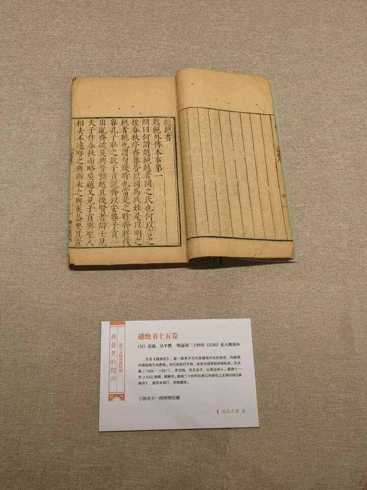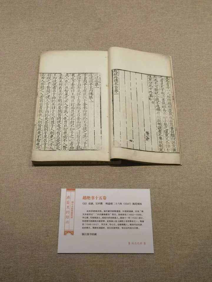这几天,在绍兴徐渭艺术馆,一场讲述越中文脉的典籍特展——“典籍里的绍兴”正在展出,其中可以欣赏到不同版本的《越绝书》。“我们向天一阁借了现存国内最早的一部《越绝书》,是嘉靖24年的孔天胤刻本,非常难得。从浙图借到了陈垲刻本,相当于是地方文献,地方人刻地方书。把各地的《越绝书》集合到一起,这是一个百年不遇的机会。”绍兴图书馆历史文献部唐微告诉记者。