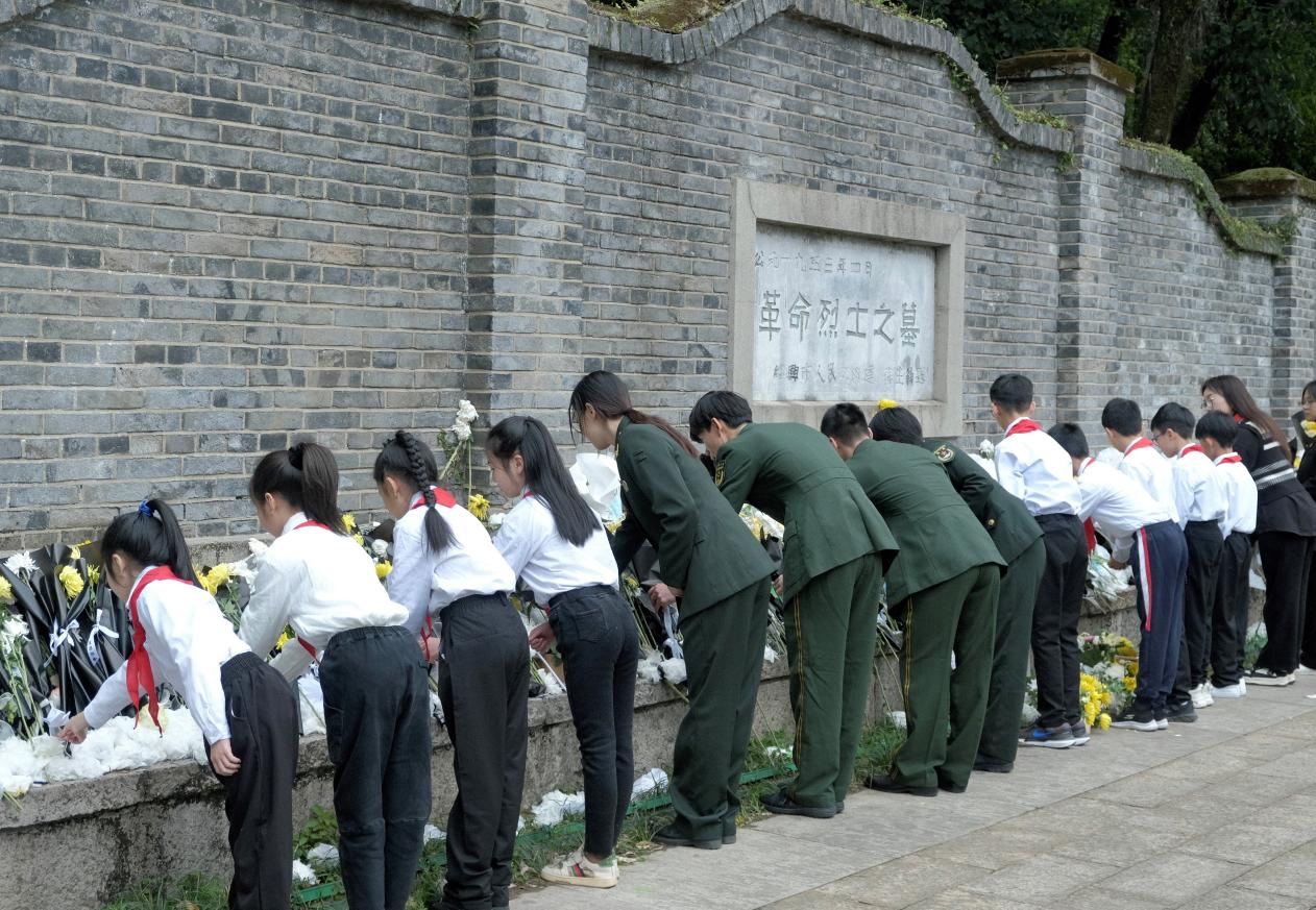 绿树环抱,青山作证,在庄严肃穆的氛围中,祭扫仪式正式开始。全体人员敬礼肃立。面向庄严的革命烈士纪念碑,全体人员默哀一分钟。学生党支部和元培小学党支部向烈士纪念碑敬献花圈,师生代表仔细整理花圈挽联。