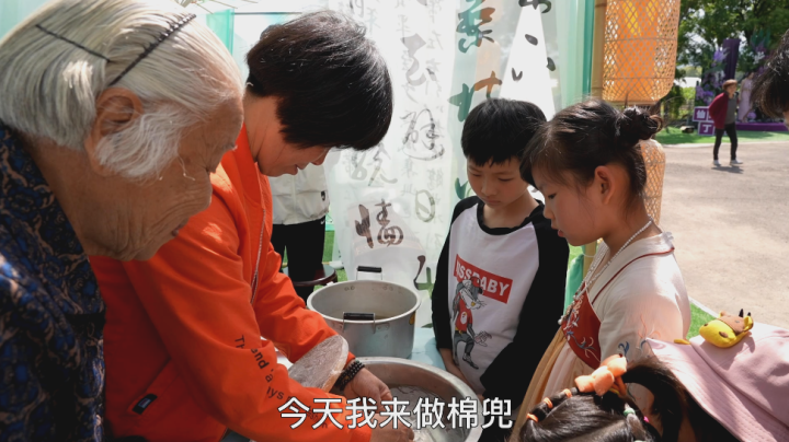 果园边,91岁的村民王小英正在教孩子们用蚕茧做棉兜,一袋蚕茧、一盆清水,转眼间,一个个蚕茧在她手中拉扯均匀,变成了一个个小绵兜,像一片片云朵。孩子们兴致勃勃地学习着,还有人自告奋勇体验一番。