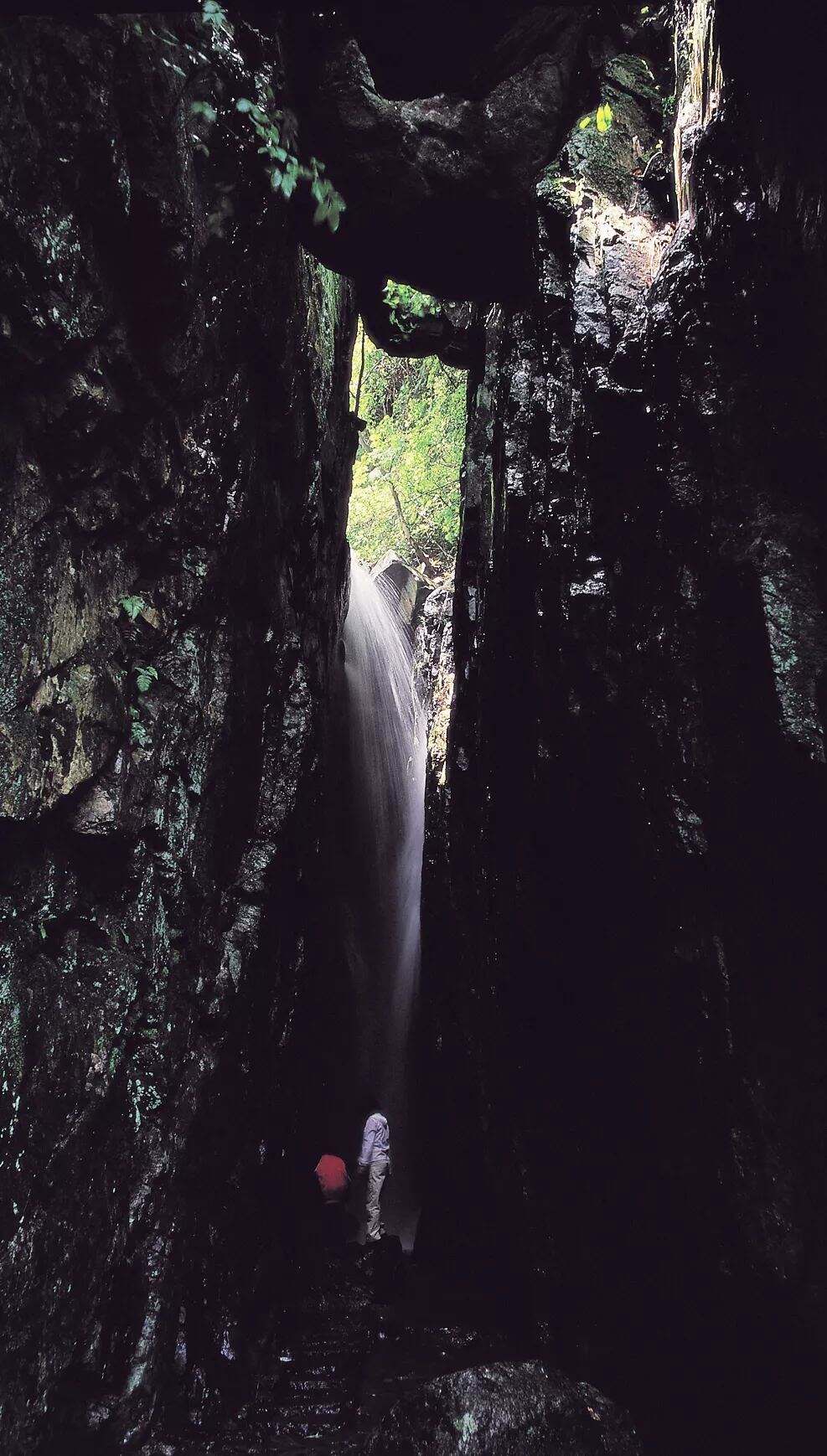 瀑之下,是潭。瀑之白,如碎雪,如樱花瓣;潭之青,如幽梦,如玻璃汁。不知何故,此时雨停了,太阳露出脸儿。摇曳的阳光照在头顶,如少女温柔的眼神;悠然的瀑声响在耳畔,如瓦屋中远古的歌谣。站在瀑外,要不了多少时间,细濛濛的瀑水便让人衫湿面润,鬓发滴珠。援手接抚瀑水,在水的冲打下,是隐隐的作痛,自然,亦有隐隐的快慰。可不是?那一种零距离接触的快意自使人飘然欲仙。而自己也在那一刻成为瀑布的一分子,让情感、让思绪随瀑流放纵奔泻。